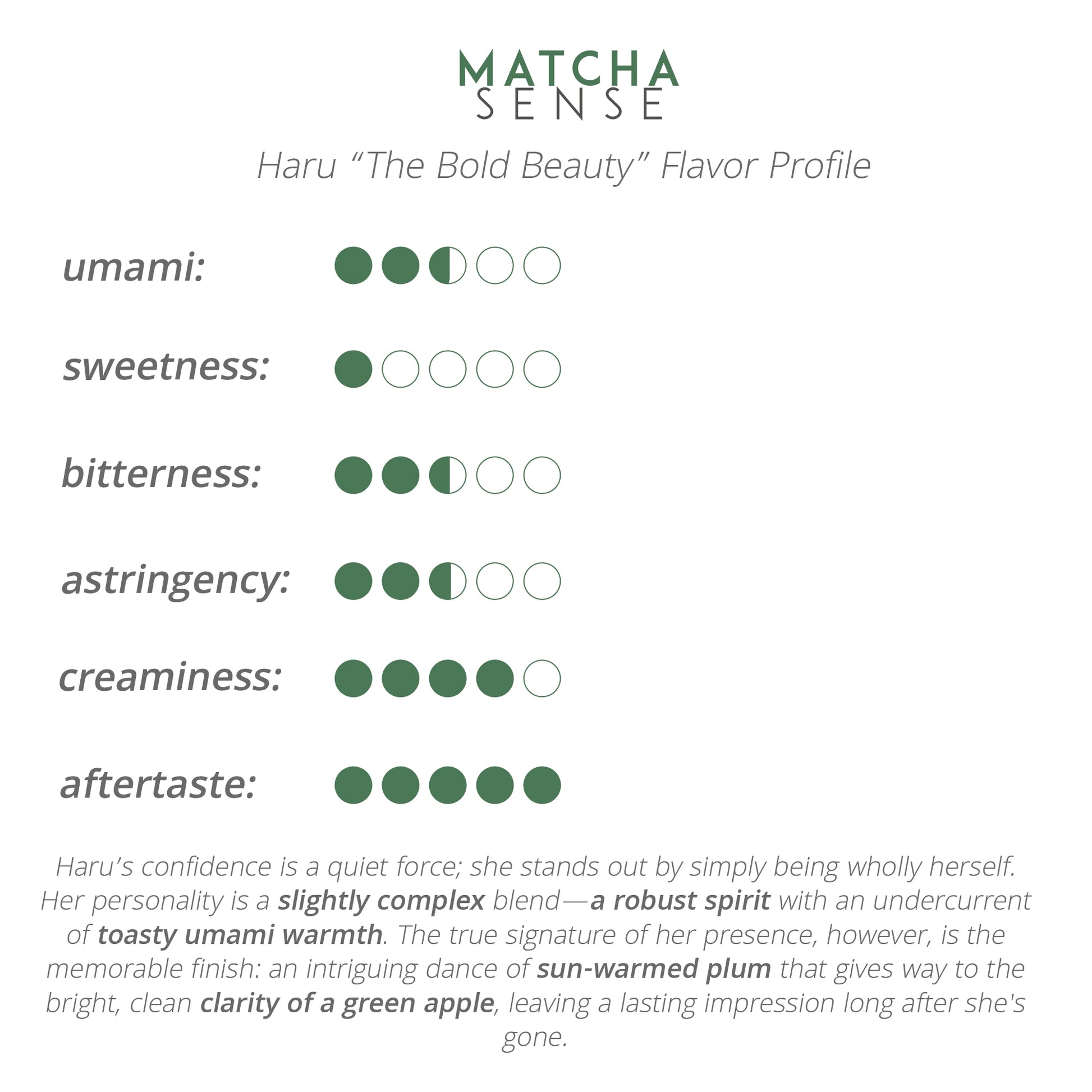Haru’s confidence is a quiet force; she stands out by simply being wholly herself. Her personality is a slightly complex blend—a robust spirit with an undercurrent of toasty umami warmth. The true signature of her presence, however, is the memorable finish: an intriguing dance of sun-warmed plum that gives way to the bright, clean clarity of a green apple, leaving a lasting impression long after she's gone.